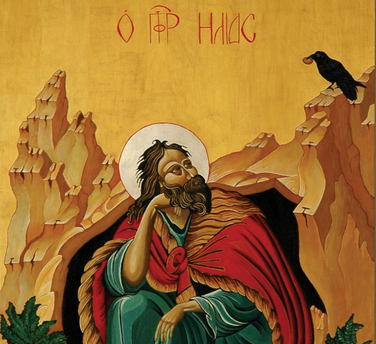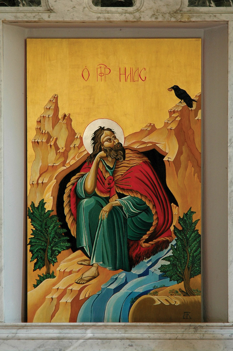 Ikonografski prikaz sv. Ilije u špilji s gavranom koji mu donosi hranu – rad Brune Periš iz 2010. godine