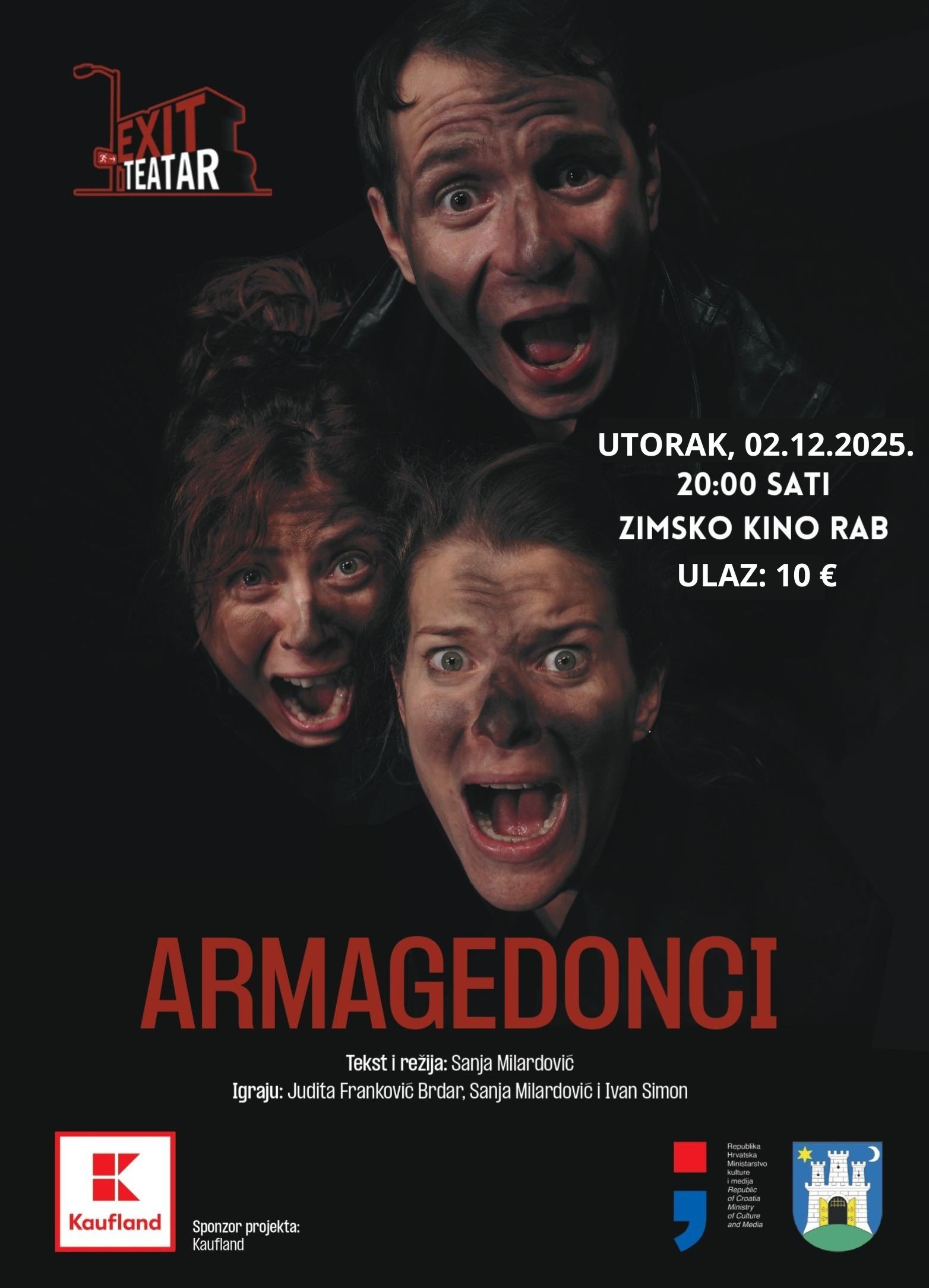 U organizaciji Pučkog otvorenog učilišta Rab te pod pokroviteljstvom Grada Raba, u utorak, 02. prosinca 2025. godine održat će se kazališna predstava “Armagedonci” u izvedbi Teatra Exit.