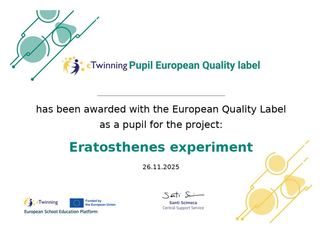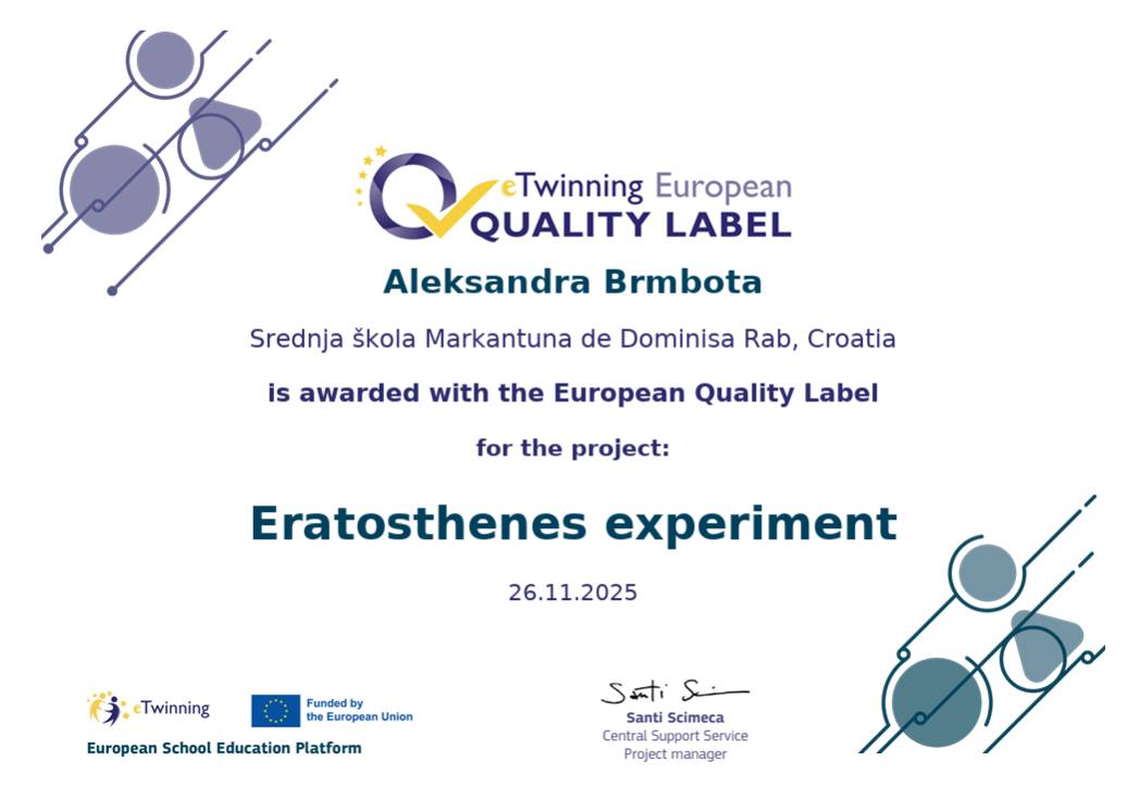 U SŠ Markantuna de Dominisa Rab stiglo je novo priznanje europske razine! Prošlogodišnji eTwinning projekt „Eratosthenes Experiment“ nagrađen je prestižnom Europskom oznakom kvalitete (European Quality Label – EQL).