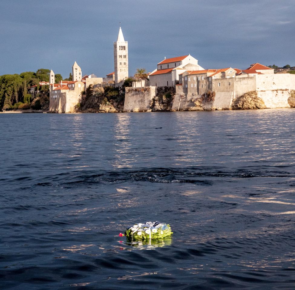 U jutarnjim satima, kapetan Lučke ispostave Rab, Christian Grce, te Milan Tariba, predsjednik Upravnog vijeća Lučke uprave Rab, položili su vijenac u more s broda Rapske plovidbe “Maslina“.