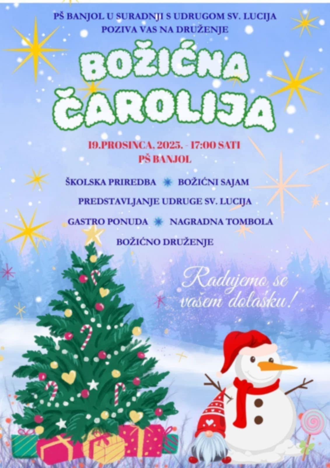PŠ Banjol u suradnji s Udrugom sv. Lucija poziva vas na blagdansko druženje “Božićna čarolija”, koje će se održati 19. prosinca 2025. u 17 sati kod PŠ-a Banjol.