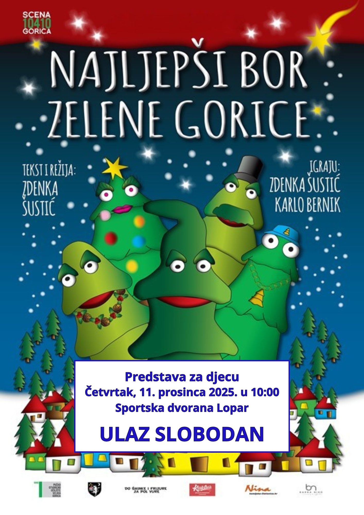 U četvrtak, 11. prosinca, u Sportskoj dvorani Lopar, s početkom u 10 sati, na rasporedu je predstava za djecu “Najljepši bor Zelene Gorice u izvedbi Scene Gorica. Ulaz je slobodan.