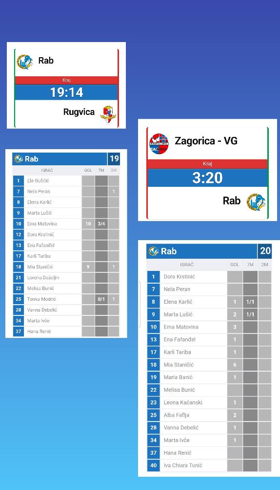 Druga je utakmica protiv ekipe Zagorice – VG bila drugačijeg karaktera i ranu visoku prednost je trener Ribarić iskoristio kako bi priliku za igru dao svim djevojčicama tako da se velik broj djevojčica upisao i u listu strijelaca. “Bravo za trenera i sve djevojčice!” poručili su iz RK-a Rab.
