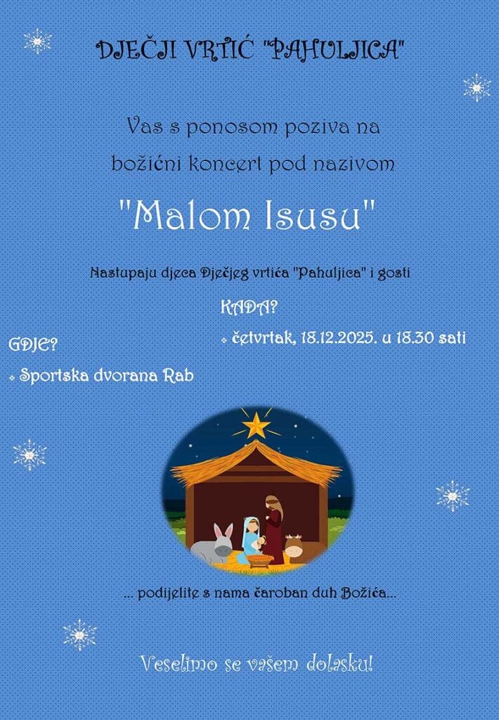 Dječji vrtić Pahuljica uputio je poziv na tradicionalni božićni koncert pod nazivom “Malom Isusu”, koji će se održati u četvrtak, 18. prosinca 2025., s početkom u 18.30 sati, u Sportskoj dvorani Rab.