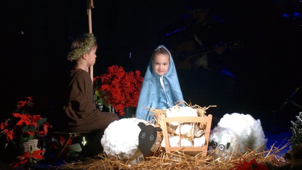 Program je započeo glazbenim uvodom – pjesmom “Djetešce nam se rodilo”, koju su na gitari izveli Marino Pahljina i Dino Gušćić, stvarajući primjereno ozračje adventske radosti i iščekivanja Božića, dok su na pozornici lik Sv. Marije i Sv. Josipa uprizorili Jakov Kordić i Marija Pahljina.