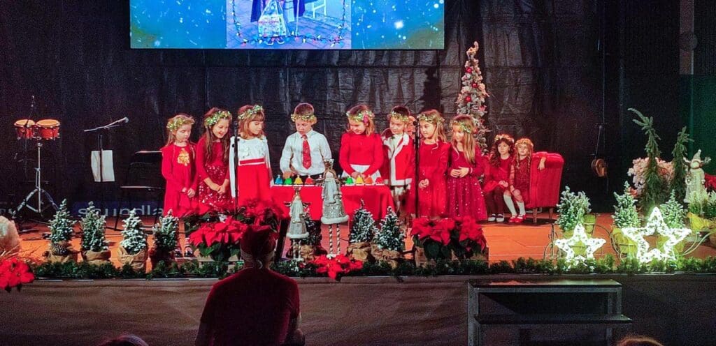 Djeca iz glazbenog programa potom su izvela pjesmu “Djed Mraz stiže u naš grad”, uz pratnju svoje voditeljice Kristine Holjar, a zatim su skupine Mravi i Manjugice oduševile publiku pjesmom “Feliz Navidad”, ponovno uz klavirsku pratnju Kristine Holjar.