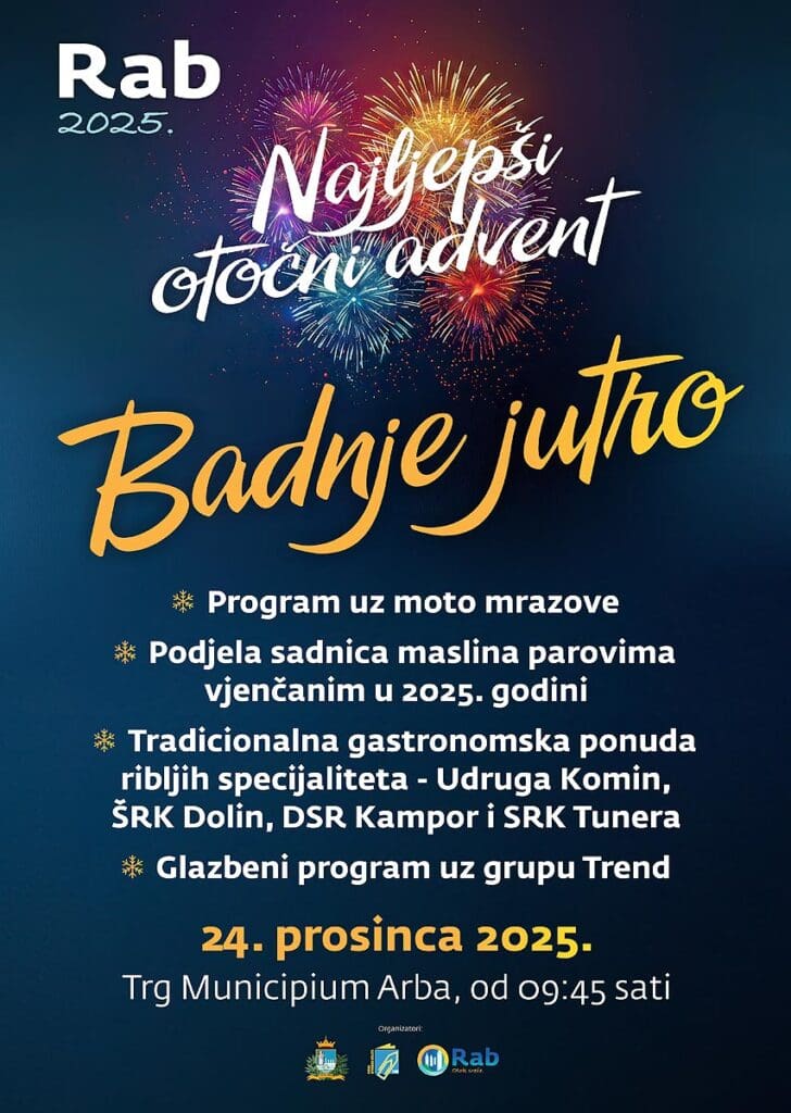 Na sam Badnjak, 24. prosinca 2025., Rabljane i njihove goste očekuje tradicionalno i toplo Badnje jutro na Trgu Municipium Arba, s početkom u 09:45 sati, u sklopu manifestacije Najljepši otočni advent na Rabu.