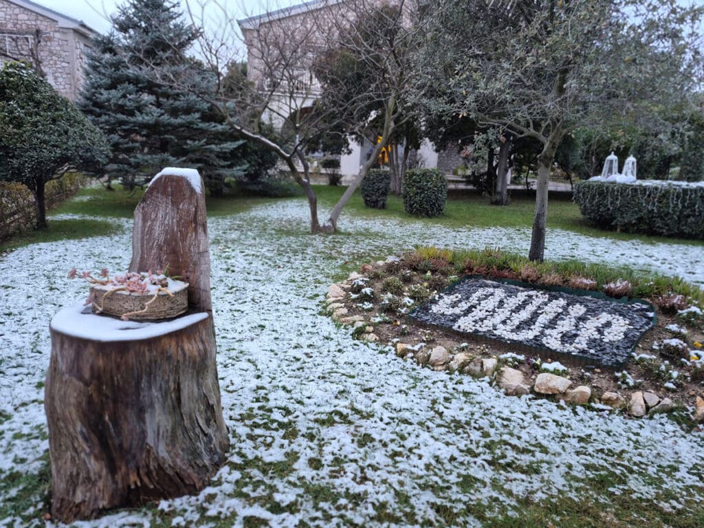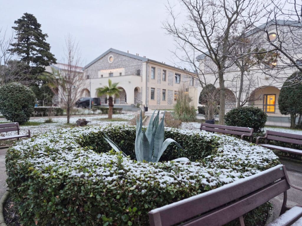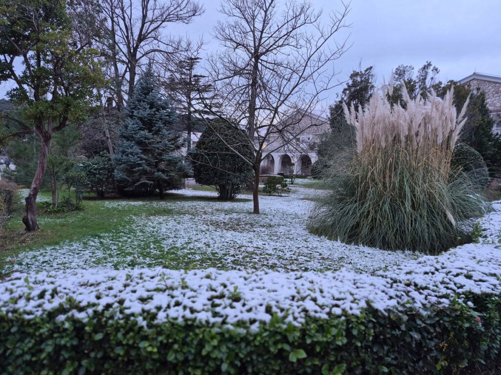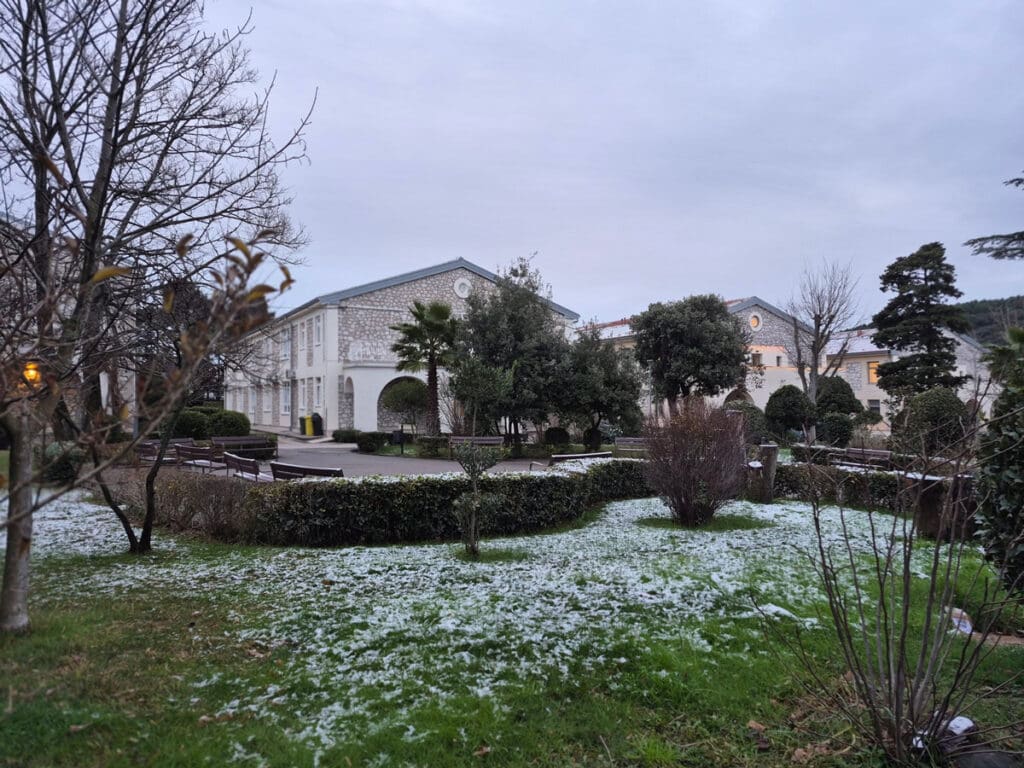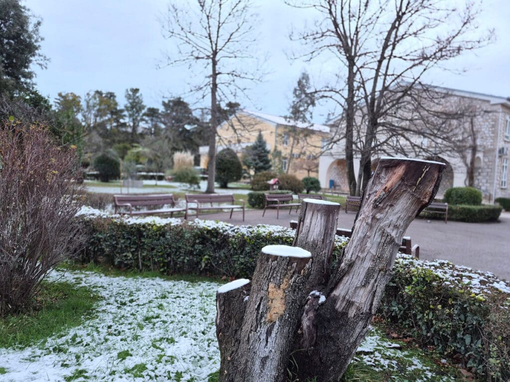 Tragovi prvog ovogodišnjeg snijega sramežljivo su zabijelili bolnički krug Specijalne županijske bolnice Insula na otoku Rabu, donijevši rijetku, ali posebno lijepu zimsku atmosferu.