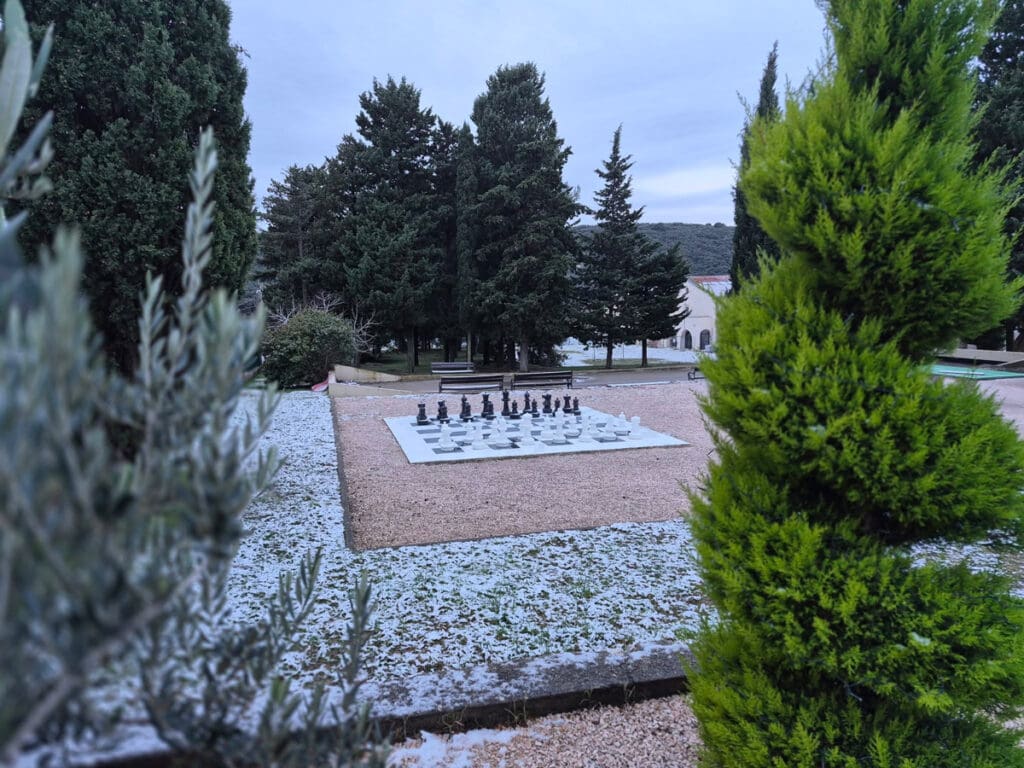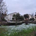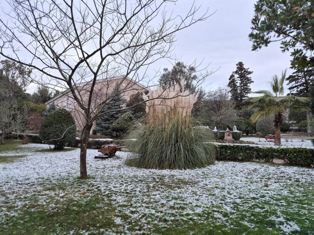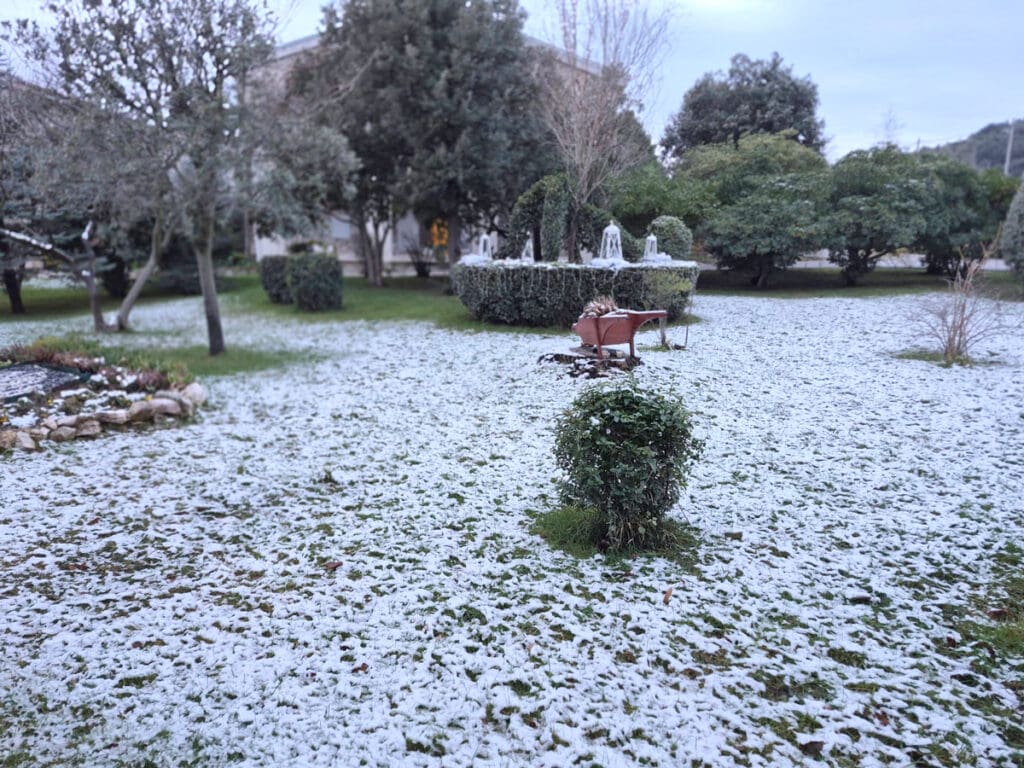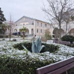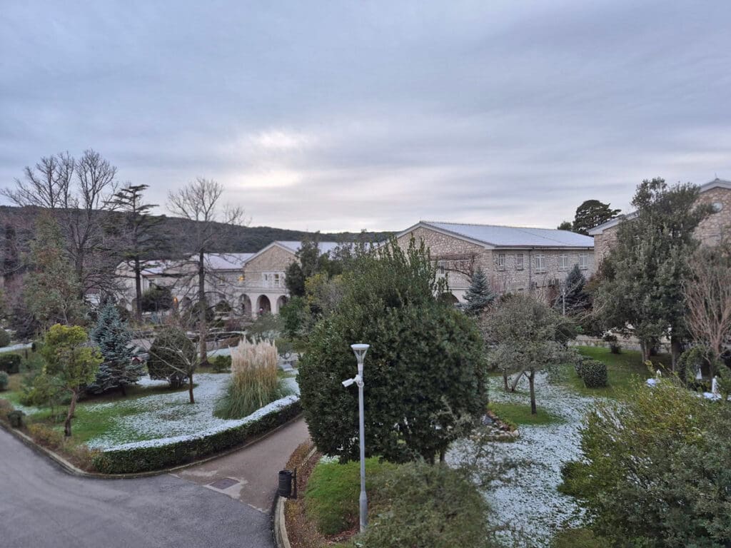 Tragovi prvog ovogodišnjeg snijega sramežljivo su zabijelili bolnički krug Specijalne županijske bolnice Insula na otoku Rabu, donijevši rijetku, ali posebno lijepu zimsku atmosferu.