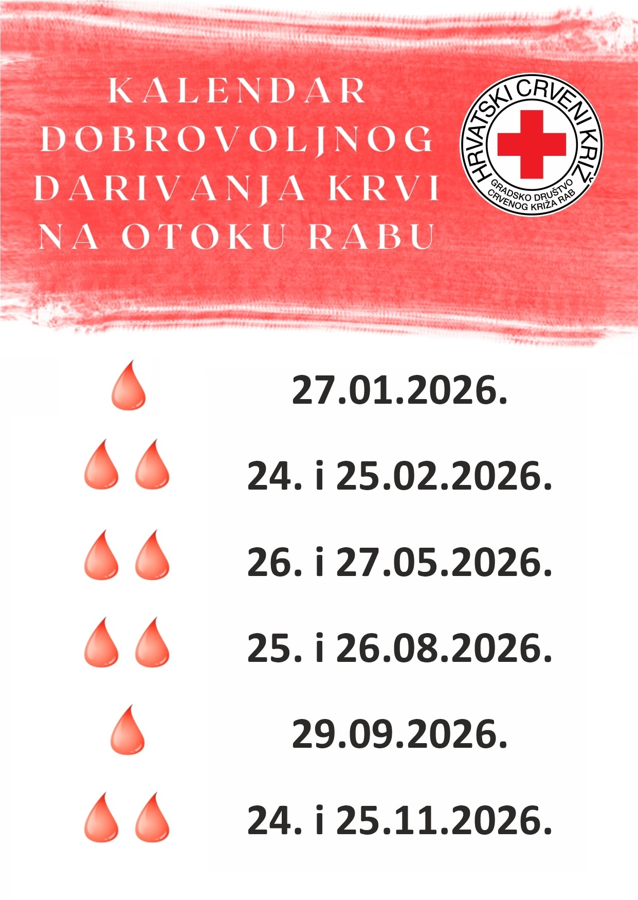 Gradsko društvo Crvenog križa Rab objavilo je kalendar akcija dobrovoljnog darivanja krvi za 2026. godinu. Datumi su sljedeći: