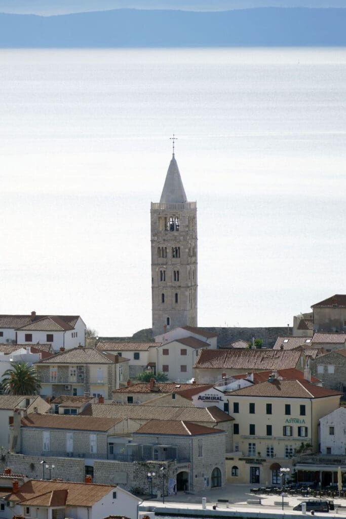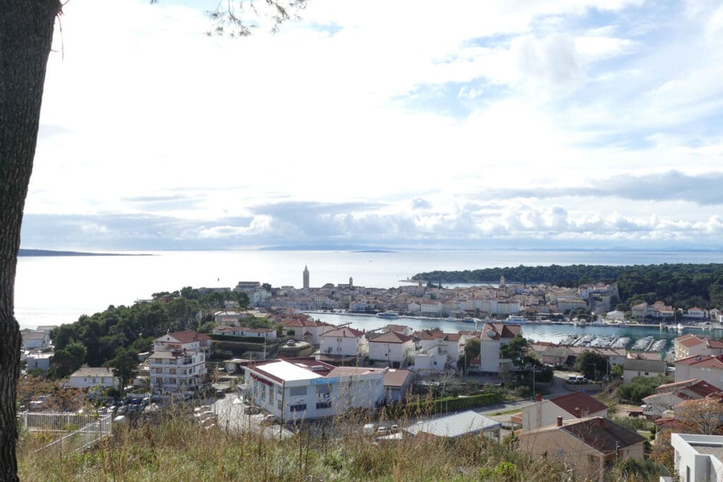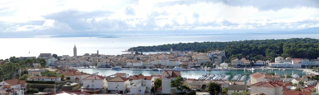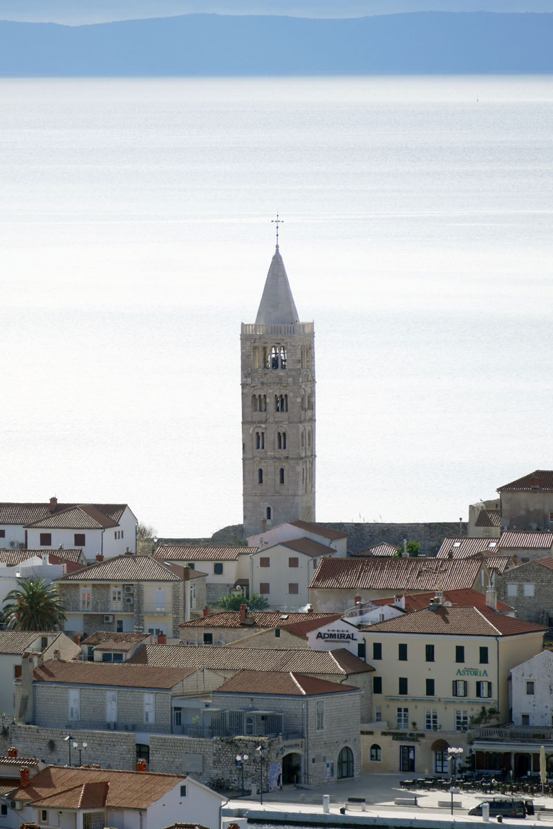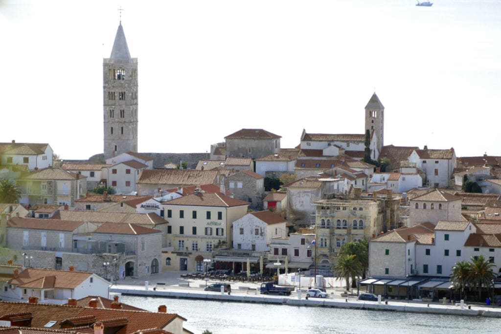 Drugi niz fotografija hvata povijesnu jezgru grada u mekanom, sjeniranom poslijepodnevnom svjetlu. Krovovi, zvonici i uske ulice, Trg Municipium Arba, pa i barke u luci, djeluju prisno i toplo, dok pogled prema pučini, prema Dolfinu i još dalje prema Lošinju i Cresu donosi osjećaj otvorenosti. More je mirno, gotovo meditativno, kao modri produžetak grada.