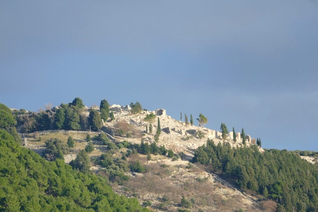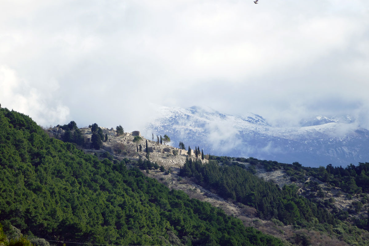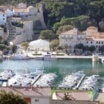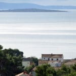 Tamo u daljini diskretno se naziru ostaci utvrde sv. Damjana na Kamenjaku – tihi podsjetnik na bizantsku prisutnost i stratešku važnost otoka. Iza utvrde, gotovo nestvarno, uzdiže se Velebit: snježan, osunčan, djelomično zaklonjen oblacima, kao suptilna kulisa koja fotografijama daje novu dimenziiju širine.