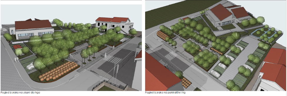 Uređenjem centra mjesta, izgradnjom općinskog trga, stvoriti će se dvije intimne zone susreta i “ćakule”. Prirodno zasjenjenje misao je vodilja ovog oblikovanja, koje će korisniku u vrućim ljetnim danima dati predah u sjeni stablašica. Pješačke staze koje vode do nove i stare zgrade dječjeg vrtića skladno će biti povezane sa susjednom zonom parkirališta, a sve u cilju povećanja sigurnosti djece.