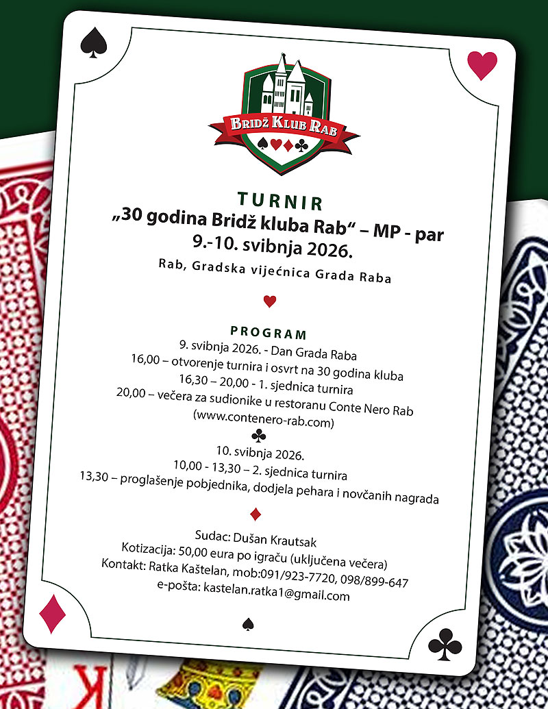 U svibnju ove godine Bridž klub Rab obilježit će 30 godina od osnivanja, a tim povodom, uz potporu Grada Raba, organizira prigodni turnir pod nazivom “30 godina Bridž kluba Rab” – MP par.