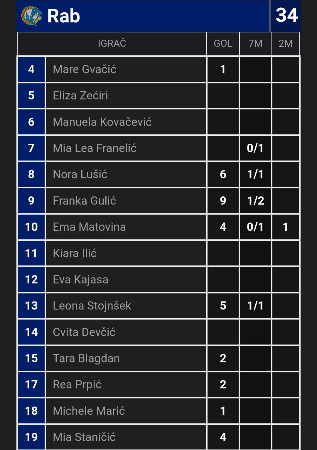 Druga utakmica, protiv trenutno vodeće ekipe prvenstva – Omišlja, bila je znatno zahtjevnija i borbenija. Ipak, Rabljanke su i u ovaj susret ušle maksimalno fokusirano te su u 24. minuti uspjele preokrenuti rezultat u svoju korist. Do kraja susreta zadržale su prednost i zasluženo slavile. Ovim pobjedama osvojile su nova četiri boda te se trenutačno nalaze na drugom mjestu prvenstvene ljestvice, koje vodi izravno na državnu završnicu.