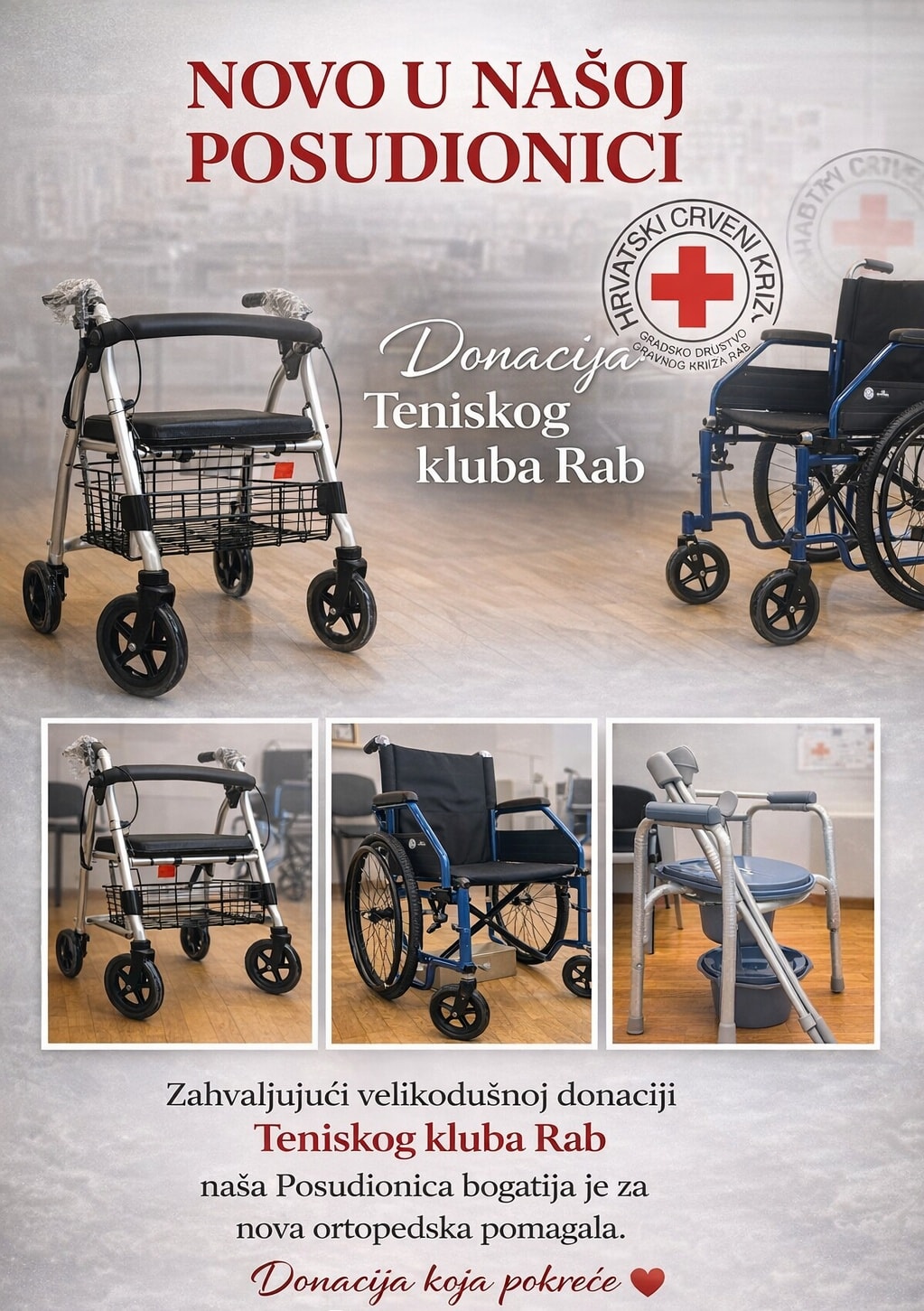 Iz Crvenog križa Rab pozivaju sve sugrađane koji su u posjedu ortopedskih pomagala iz Posudionice, a koja im više nisu potrebna, da ih vrate kako bi mogla služiti drugima. Također, upućen je poziv svima koji su u mogućnosti donirati ispravna i očuvana ortopedska pomagala da se jave, kako bi se zajedničkim snagama pomoglo još većem broju ljudi.