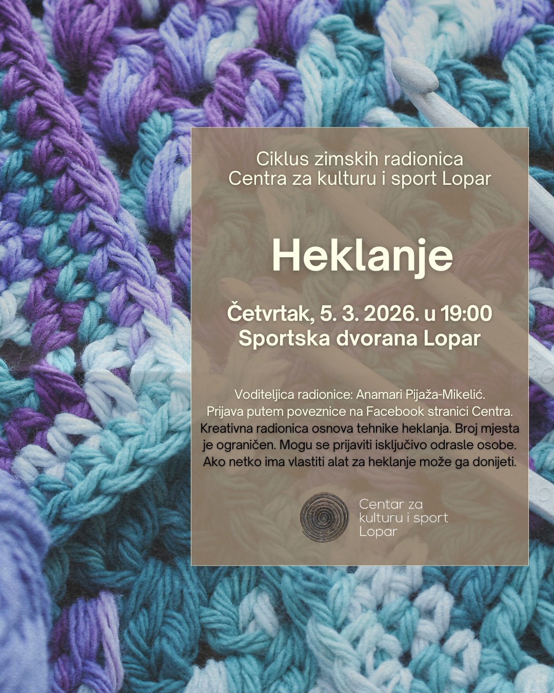 U sklopu ciklusa zimskih radionica, Centar za kulturu i sport Lopar organizira kreativnu radionicu heklanja koja će se održati u četvrtak, 5. ožujka 2026. godine, s početkom u 19:00, u Sportskoj dvorani Lopar.