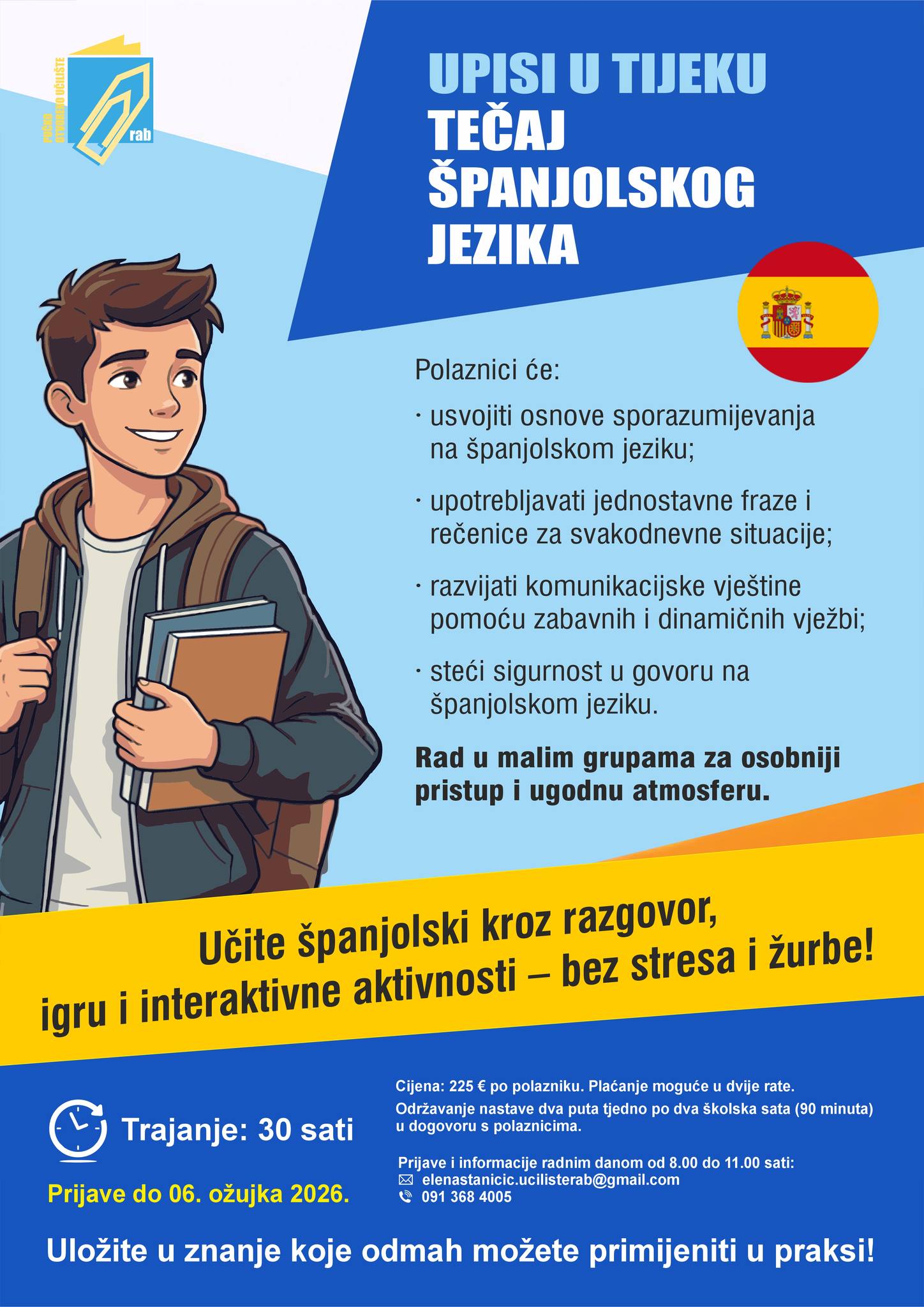 Pučko otvoreno učilište Rab najavilo je ponovno otvaranje prijava za tečaj španjolskog jezika zbog velikog interesa.
