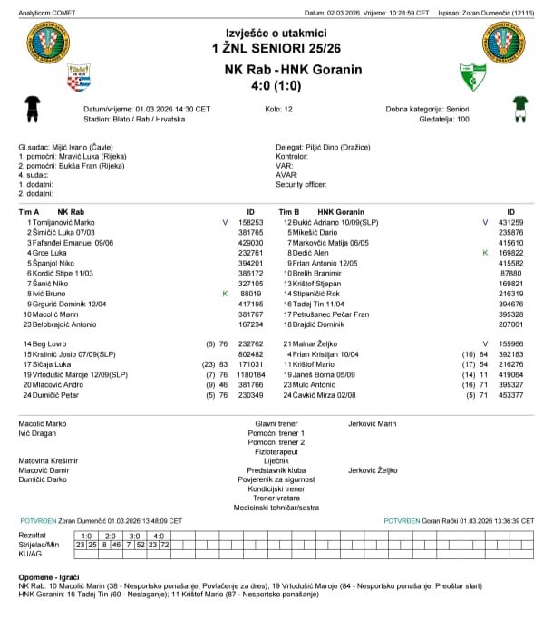 Seniori NK Rab upisali su uvjerljivu pobjedu u zaostaloj prvenstvenoj utakmici protiv HNK Goranin, svladavši goste rezultatom 4:0. Susret se igrao u nedjelju, 1. ožujka 2026. s početkom u 14:30 sati na igralištu Blato, pred oko 100 gledatelja.