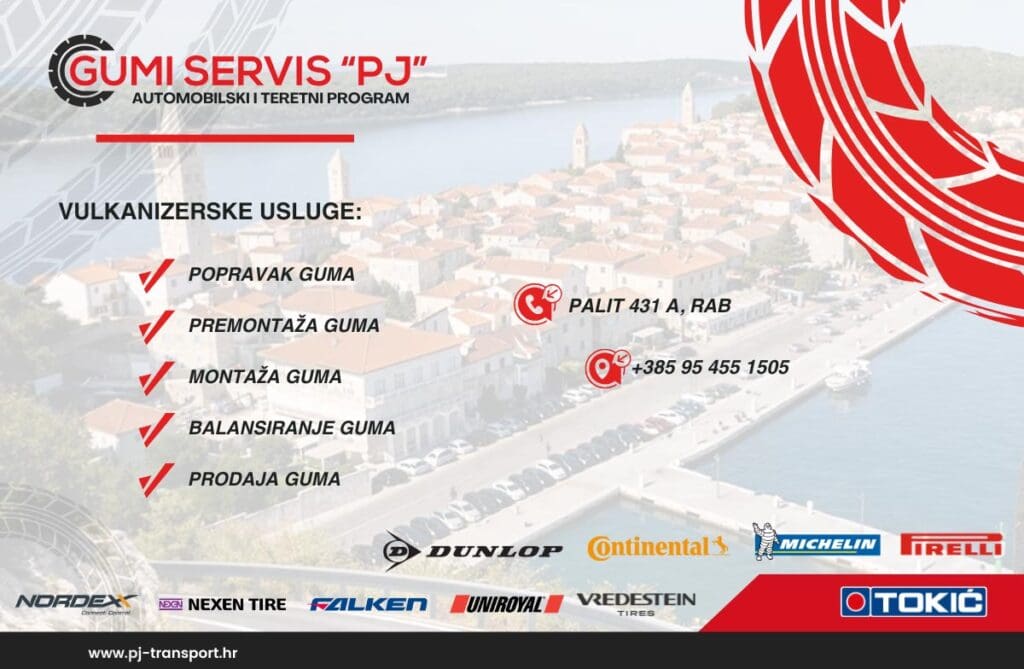 Ako tražite pouzdanu i brzu uslugu, na otoku Rab djeluje GUMI SERVIS “PJ” na adresi Palit 431A (odmah pored trgovine Tommy), gdje zamjenu obavlja stručno osoblje, uz uslugu na koju se vozači mogu pouzdati, što je posebno važno u razdoblju pripreme za sezonu.