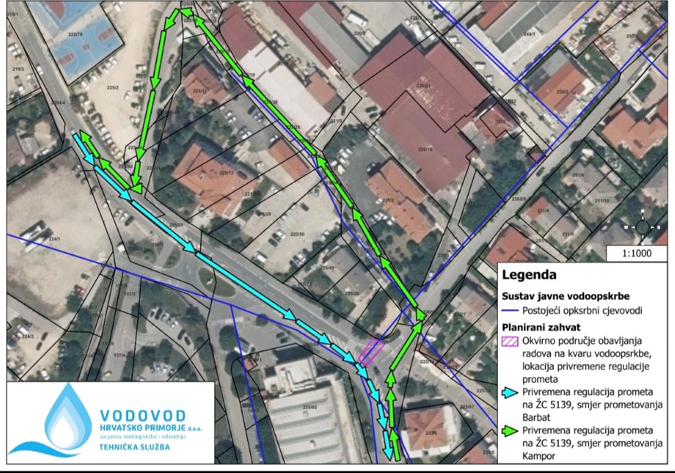 Zbog izvođenja radova na sanaciji kvara na vodoopskrbnom sustavu doći će do zatvaranja dijela prometnice kod sportske dvorane u Rabu, te uvođenja privremene regulacije prometa.