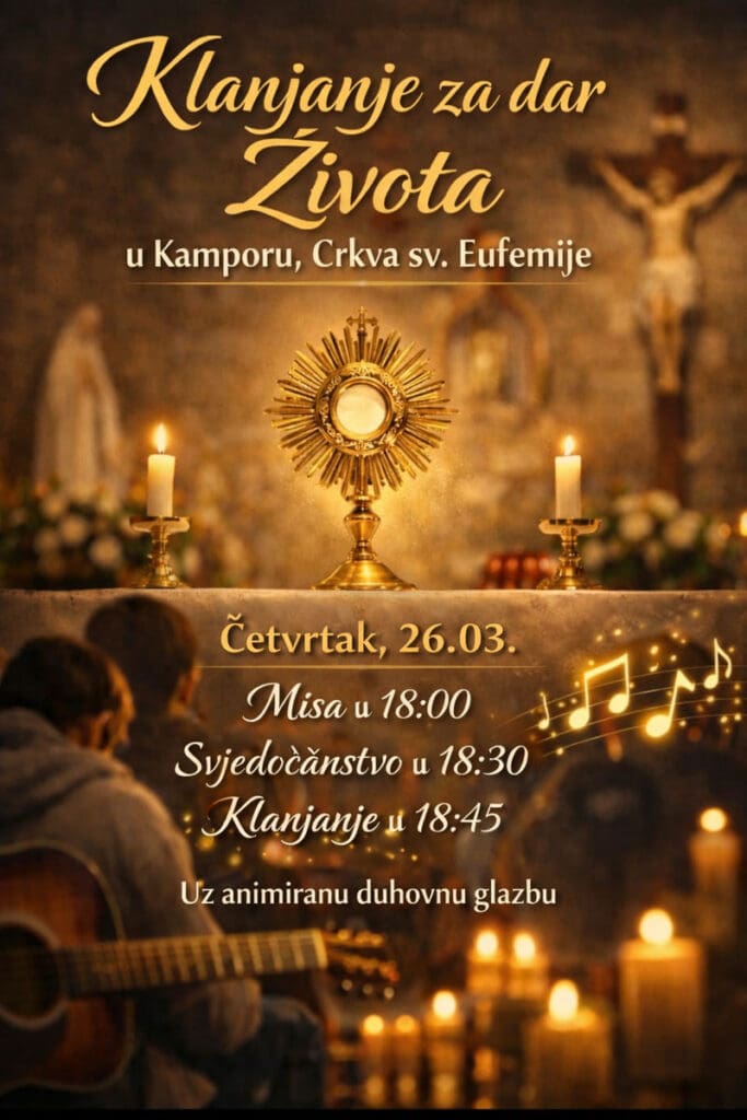 U četvrtak, 26. ožujka 2026., u crkvi sv. Eufemije u Kamporu održat će se večer molitve pod nazivom “Klanjanje za dar života”, na koju su pozvani svi vjernici i ljudi dobre volje.