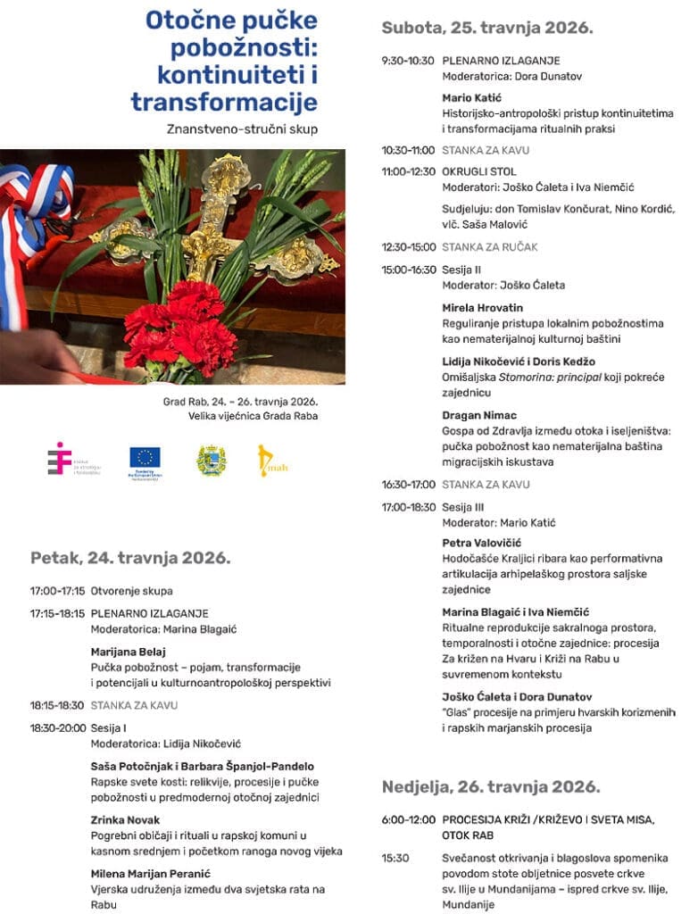 Znanstveno-stručni skup “Otočne pučke pobožnosti: kontinuiteti i transformacije” održat će se u Rabu od 24. do 26. travnja 2026. u organizaciji i uz potporu Instituta za etnologiju i folkloristiku, Zagreb, Grada Raba, Pučkog otvorenog učilišta Rab i Centra za istraživanje srednjovjekovne baštine Jadrana RIMAH.
