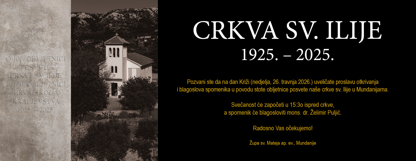 Župa sv. Mateja ap. ev. iz Mundanija poziva sve vjernike, mještane i ljude dobre volje na veliku proslavu u povodu stote obljetnice posvete crkve sv. Ilije. Svečani program održat će se ove nedjelje, 26. travnja 2026. godine, na dan tradicionalnih Križi, kada će biti otkriven i blagoslovljen prigodni spomenik.