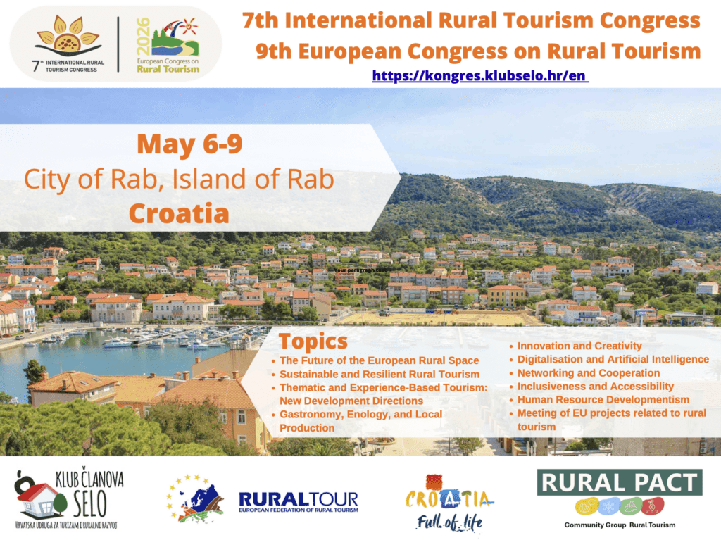 Od 6. do 9. svibnja 2026. godine na otoku Rabu će se održati 7. međunarodni kongres o ruralnom turizmu, zajedno s 9. europskim kongresom o ruralnom turizmu, čime će naš otok i grad Rab postati jedno od ključnih mjesta susreta stručnjaka iz područja ruralnog turizma na europskoj razini.
