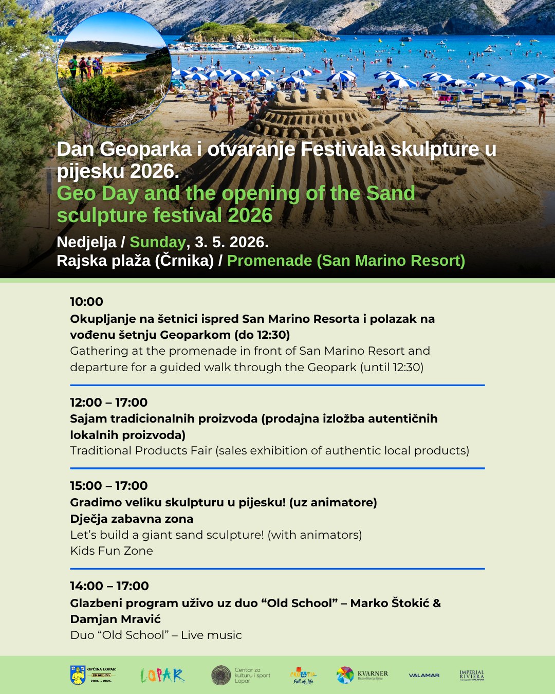 Predstojećeg vikenda, točnije u nedjelju 3. svibnja, Rajska plaža (Črnika) u Loparu postat će središte zabavnih, kreativnih i edukativnih aktivnosti. Održava se Dan Geoparka, koji ujedno označava i svečano otvaranje ovogodišnjeg Festivala skulpture u pijesku.